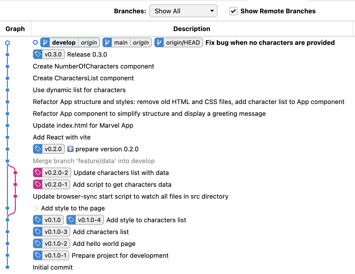 ```mermaid gitGraph checkout main commit tag: "v0.2.0" branch develop checkout develop branch feature-react checkout feature-react commit id: "add-react" commit id: "static list" commit id: "dynamic list" commit id: "CharactersList" commit id: "NumbersOfCharacters" checkout develop merge feature-react checkout main merge develop commit tag: "v0.3.0" branch hot-fix commit id: "fix" checkout main merge hot-fix checkout develop merge main ```